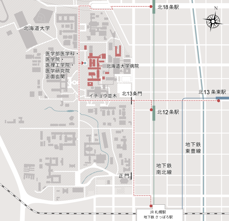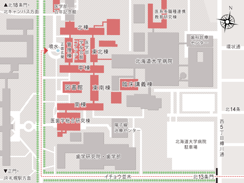 北13条門からイチョウ並木を通り、T字路を右折。噴水のあるロータリーが目印です。