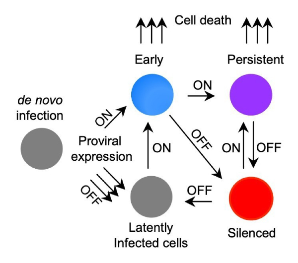 HIV-1潜伏は、HIV感染の根治における中心的な障壁であり続けている。抗レトロウイルス療法はウイルス複製を効果的に抑制するが、組み込まれたプロウイルスは沈黙状態で持続し、治療中断時に再出現する可能性がある。したがって、プロウイルスが活性転写と潜伏状態の間でどのように移行するかを理解することは、リザーバー除去または持続的な沈黙化を目的とした戦略の開発に不可欠である。