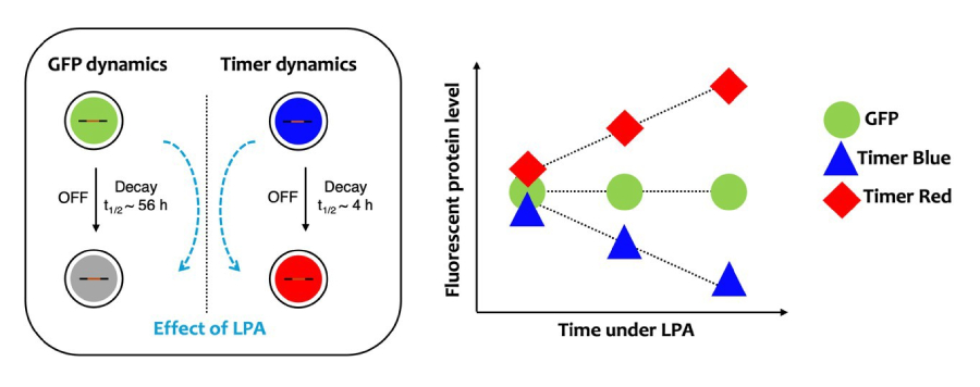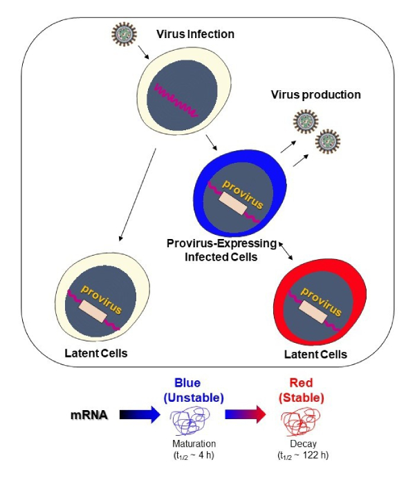従来のレポーターシステムの限界に対処するため、本研究ではHIV-1プロウイルス発現の動的履歴を捉える時間分解能レポーターであるHIV-Tockyシステムを開発した。 プロウイルス発現パターンと同期して自発的に発光スペクトルを青から赤へ変化させる蛍光タンパク質を利用することで、 HIV-Tockyはウイルス侵入後のプロウイルス転写履歴を直接可視化可能とし、個々の感染細胞内における最近の転写活性化、持続的発現、転写沈黙を区別することを可能にした。