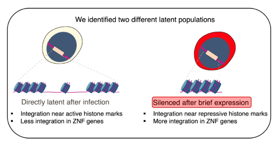 HIV-Tockyシステムを用いて、我々はHIV-1感染後の潜伏期確立過程を解析し、2つの異なる潜伏集団を同定した。1つは検出可能な発現なしに急速に潜伏期に入ったのに対し、もう1つの集団は転写沈黙の前に活性プロウイルス発現の初期段階を経た。これらの2つの集団、すなわち潜伏期への経路は、異なる統合特性と関連していた。