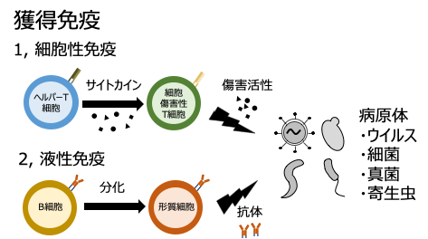 病原体が体内に入ると、まず免疫細胞がそれを見つけて取り込み、その特徴(抗原)を他の細胞に伝えます。リンパ節でT細胞がその情報を受け取ると活性化し、増えて働く細胞に変わります。ヘルパーT細胞はB細胞を助け、B細胞は抗体を作って病原体を攻撃します。細胞傷害性T細胞は、感染した細胞を直接壊します。感染が治まった後も、一部のT細胞やB細胞は記憶細胞として体内に残り、同じ病原体が再び入ってきたときに、より早く強く反応できるようになります。