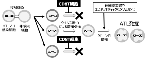 ATLにおいても、HTLV-1由来抗原(例:Tax)を標的とするCD8T細胞が存在し、腫瘍化前の感染細胞の制御に重要と考えられている。しかし、長期の抗原刺激によりCD8T細胞は機能低下(疲弊)を起こし、増殖能や殺傷能が低下する。また、腫瘍細胞側も抗原発現の低下や免疫抑制分子の発現亢進によって免疫逃避を行う。その結果、CD8T細胞による監視機構が破綻し、ATLの発症・進展につながると考えられている。