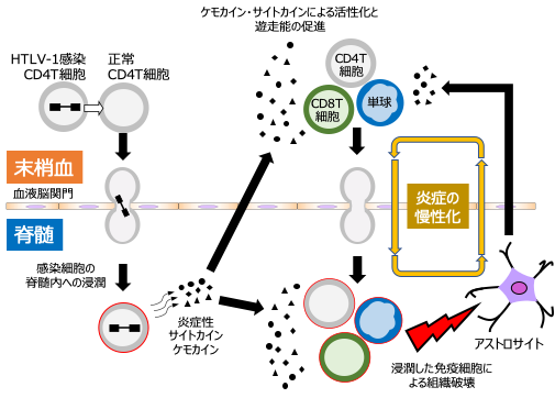 HTLV-1関連脊髄症(HAM/TSP)では、HTLV-1抗原(特にTax)を認識するCD8T細胞が末梢血や脳脊髄液中で増加し、強い細胞傷害活性と炎症性サイトカイン産生能を示す。これらのCD8T細胞は感染T細胞を排除しようとするが、過剰かつ持続的に活性化されることで脊髄内に浸潤し、周囲の神経組織に炎症を引き起こす。特にIFN-γやTNF-αなどの産生によりグリア細胞が活性化し、慢性的な組織障害が進行する。その結果、下肢の痙性麻痺や排尿障害などの症状が生じる。つまりCD8T細胞は、ウイルス制御と同時に病態形成にも深く関与する両義的な存在である。