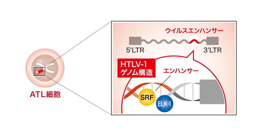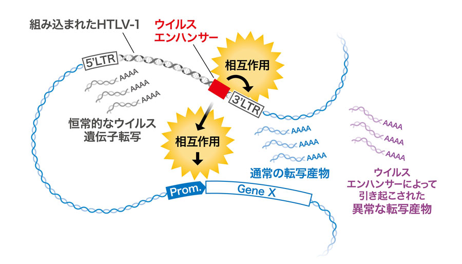 ATL細胞の宿主ゲノムDNAにはプロウイルスDNAが存在します。HTLV-1に感染していなければCD4+T細胞のがんは極めてまれなため、プロウイルスの存在が細胞がん化を誘導すると考えられています。したがって、組み込まれたプロウイルスについて多くの研究が進められてきましたが、ウイルス発見から40年以上、今回特定されたウイルスエンハンサーの存在は知られていませんでした。