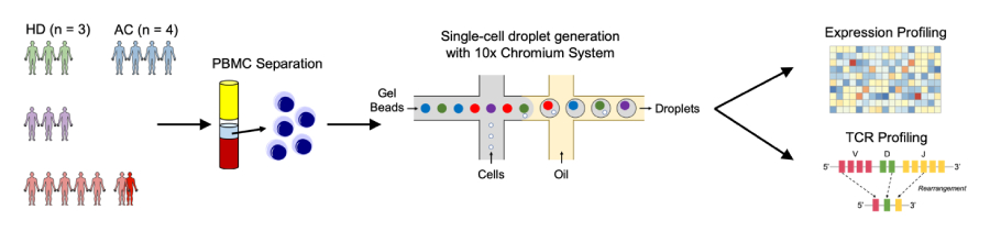 ヒトT細胞白血病ウイルス1型(HTLV-1)は主にCD4陽性T細胞および少数のCD8陽性T細胞に感染し、長い潜伏期間を好む。 感染者の約95%は無症候性キャリア(AC)のまま、3~5%は成人T細胞白血病(ATL)を発症し、1%以上はHTLV-1関連脊髄症/熱帯性痙性対麻痺(HAM/TSP)として知られる神経炎症性疾患を発症する。 同じレトロウイルスであるHTLV-1が2種類の異なる疾患を引き起こすことから、それぞれの疾患の病態を研究することが非常に重要となっている。我々の研究室では、単一細胞アプローチを用いてATLとHAM/TSPの疾患メカニズムの解明を目指している。