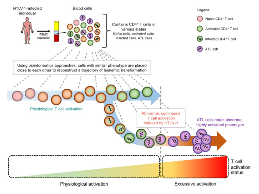 この障壁を克服するため、ヒトT細胞白血病ウイルス1型(HTLV-1)はCD4陽性T細胞自体を感染させ、成人T細胞白血病/リンパ腫(ATL)と呼ばれる特定の白血病を引き起こす。日本では少なくとも110万人のHTLV-1感染者が存在し、年間約1,500人の新規ATL患者が診断されている。 複数の研究により、HTLV-1がCD4+T細胞の分化、活性化、生存経路を変化させ、ATLへの形質転換を引き起こすことが報告されている。この過程は「HTLV-1媒介性白血病形質転換」と呼ばれる。しかし、生理的なT細胞活性化とHTLV-1媒介性活性化/形質転換との関連は依然不明である。