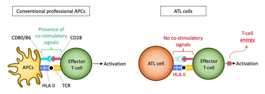 さらに、HTLV-1感染CD4+T細胞はHLAクラスII分子も発現亢進する。HLAクラスII分子は共刺激分子CD80/CD86と共に、T細胞活性化に重要な表面タンパク質である。 しかしながら、HTLV-1感染CD4+T細胞はCD80/CD86を発現せず、従ってこれらの細胞はT細胞を活性化できず、むしろT細胞の無反応状態(アナーギ)または不活化を誘導する。これにより免疫応答が抑制され、ウイルスおよび感染細胞が免疫監視を逃れることが可能となる。
