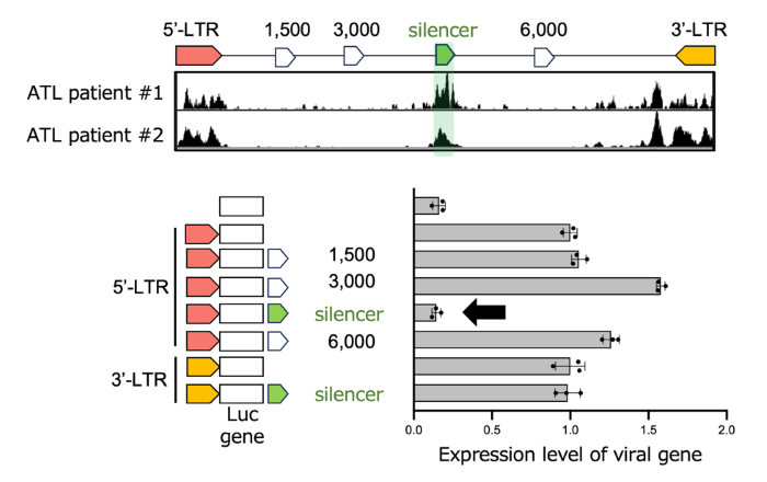 Using chromatin and functional analyses of patient-derived material and experimental systems, we identified an open chromatin region (OCR) within the HTLV-1 proviral genome (overlapping the pol region). Functional assays demonstrated that this region suppresses 5′LTR-driven sense transcription, revealing an intragenic “viral silencer” that helps enforce latency.