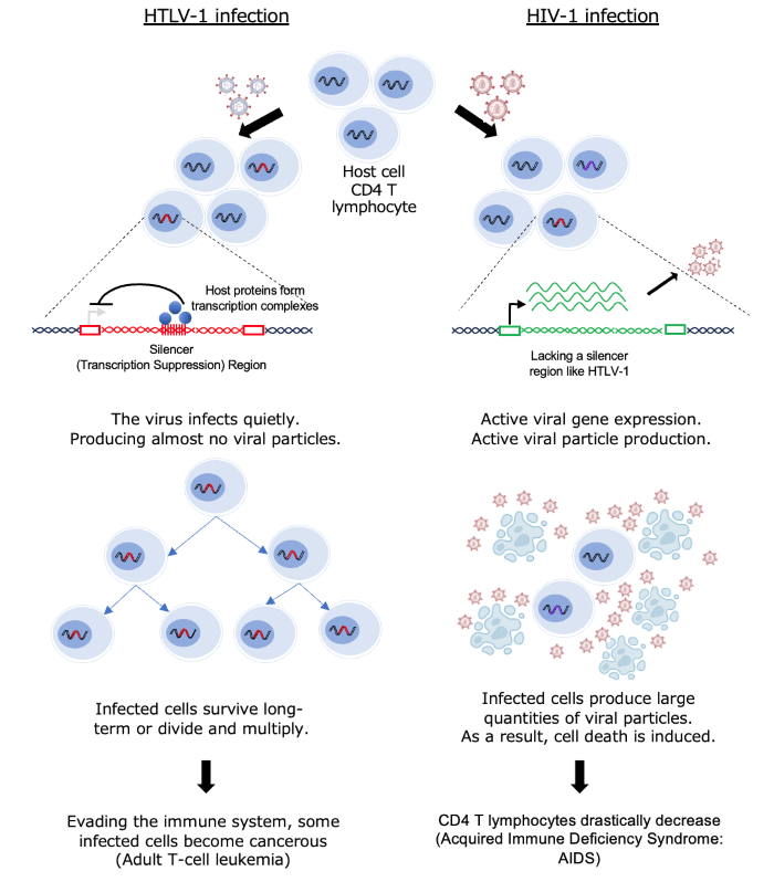 Human T-cell leukemia virus type 1 (HTLV-1) establishes long-term persistence by integrating into the host genome as a provirus. After a long incubation period, some infected individuals develop diseases such as adult T-cell leukemia (ATL). Although HTLV-1 encodes highly immunogenic gene products (e.g., Tax), viral expression is often constrained in vivo, helping infected cell clones evade immune surveillance. The molecular mechanisms that actively maintain this low-expression state (latency) have remained a central question.