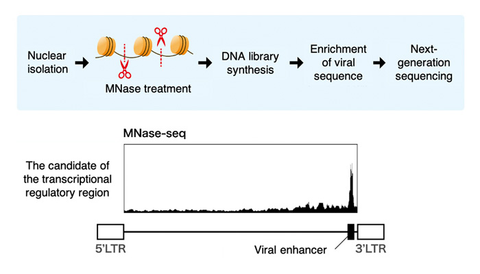 This study revealed the existence of a novel enhancer region in the HTLV-1 provirus and that function, which could not be found by conventional methods, by analyzing patient samples using advanced research methods such as next-generation sequencing and single cell analysis. The results of this study clarify one aspect of the mechanism of persistence and pathogenicity of HTLV-1 infection, and that will lead to a step overcoming the problem of HTLV-1 infection.