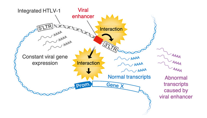 The host genomic DNA of ATL cells contains proviral DNA, and the presence of the provirus is thought to induce cellular oncogenesis, since CD4+ T cell cancers are extremely rare unless infected with HTLV-1. Therefore, although many studies have been conducted on the integrated provirus, the existence of the viral enhancer identified in this study was unknown for more than 40 years after the discovery of the virus.
